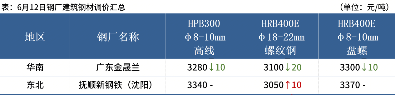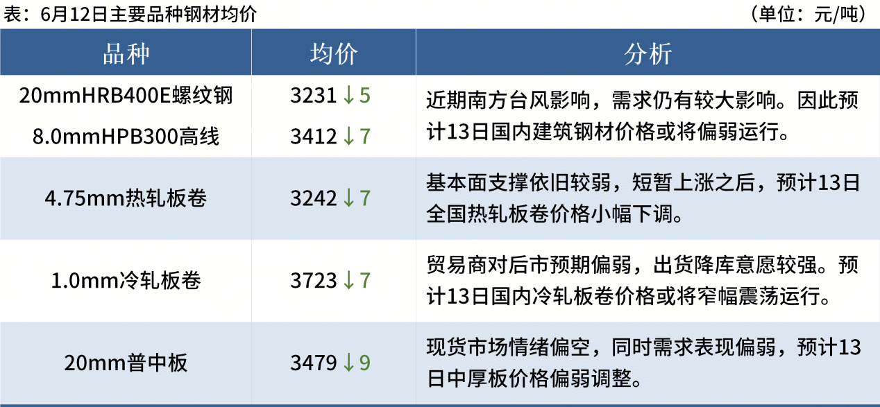 ◎ 6月12日,國內(nèi)鋼材市場震蕩偏弱運(yùn)行,唐山遷安普方坯出廠含稅下跌30報(bào)2890元/噸。