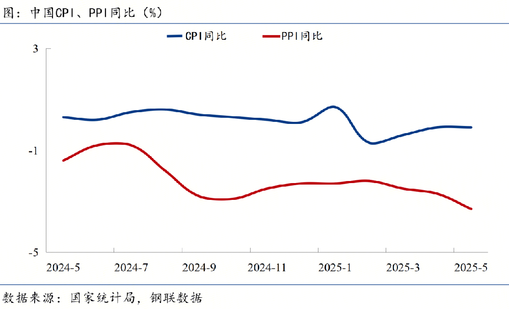 ◎ 國(guó)家統(tǒng)計(jì)局:5月份,中國(guó)CPI同比下降0.1%,降幅與上月持平。5月PPI同比下降3.3%,降幅比上月擴(kuò)大0.6個(gè)百分點(diǎn)。其中,5月黑色金屬冶煉和壓延加工業(yè)同比下降10.2%,降幅比上月擴(kuò)大1.6個(gè)百分點(diǎn)。