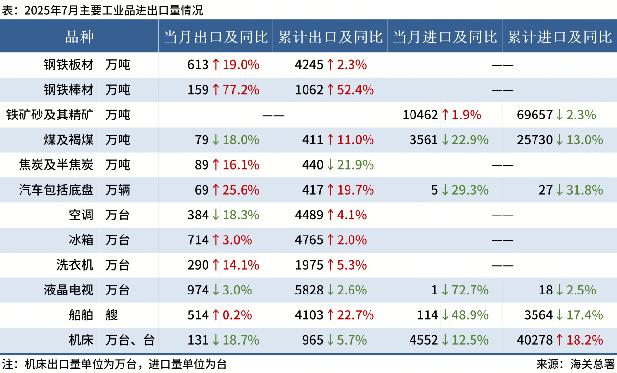 ◎ 海關(guān)總署數(shù)據(jù)顯示,2025年7月,中國(guó)出口鋼鐵棒材159萬(wàn)噸,同比增長(zhǎng)77.2%。具體如下: