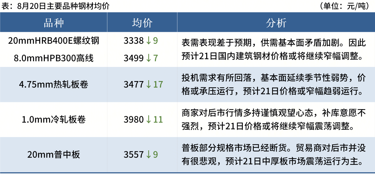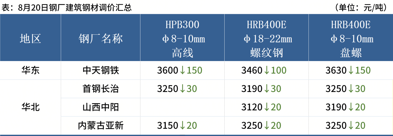 ◎ 8月20日,中天鋼鐵出臺8月下旬價格,螺紋鋼下調100元/噸,線材盤螺下調150元/噸。