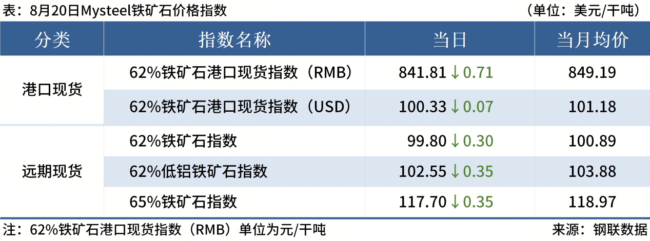 ◎ 8月20日,Mysteel進口鐵礦石62%澳洲粉礦遠期現(xiàn)貨指數(shù)99.8美元/干噸,跌0.3美元/干噸,月均100.89美元/干噸。