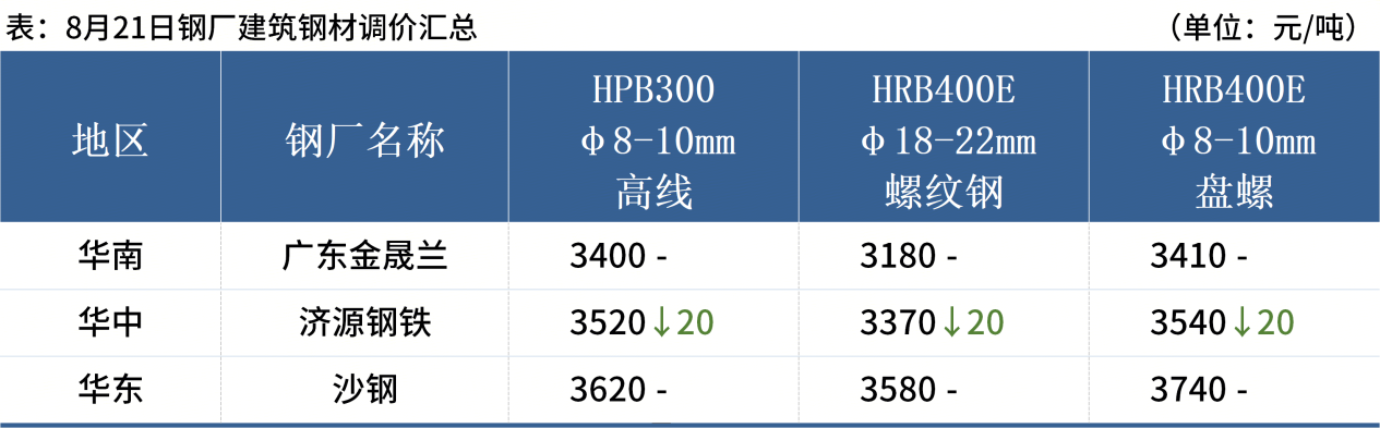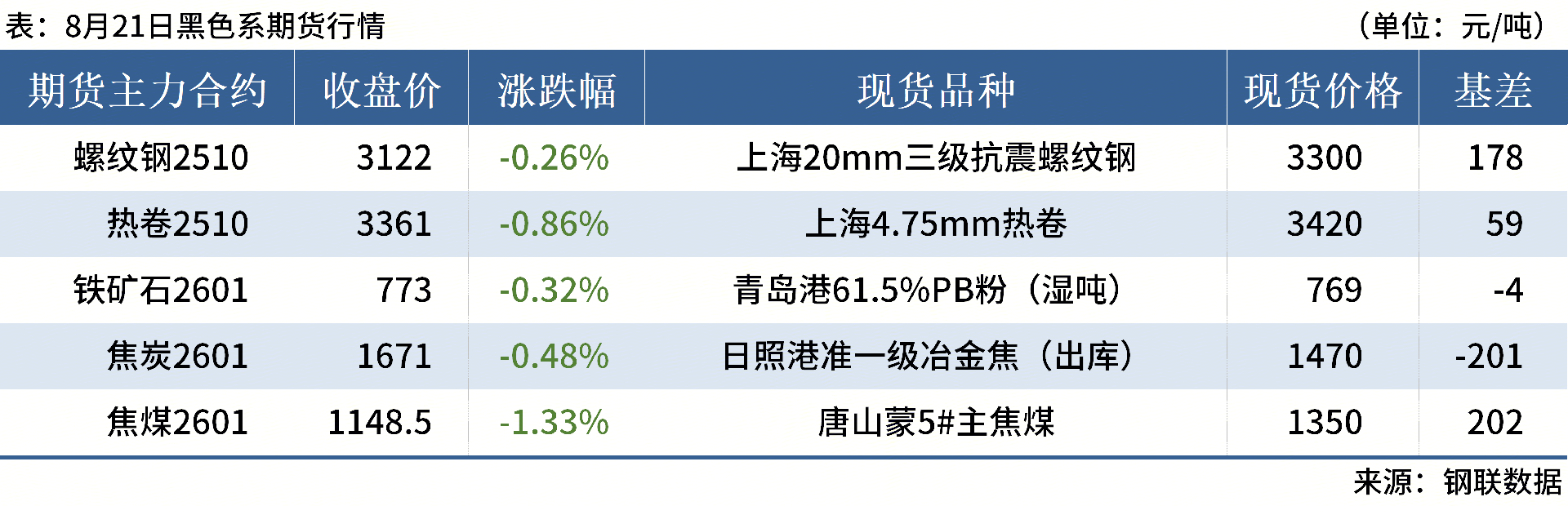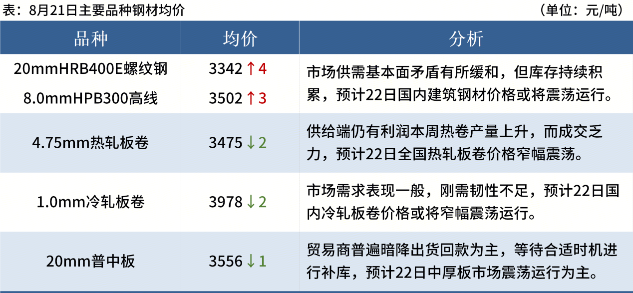 ◎ 8月21日,全國主港鐵礦石成交91.70萬噸,環(huán)比減22.9%;237家主流貿(mào)易商建筑鋼材成交9.35萬噸,環(huán)比減8.5%。