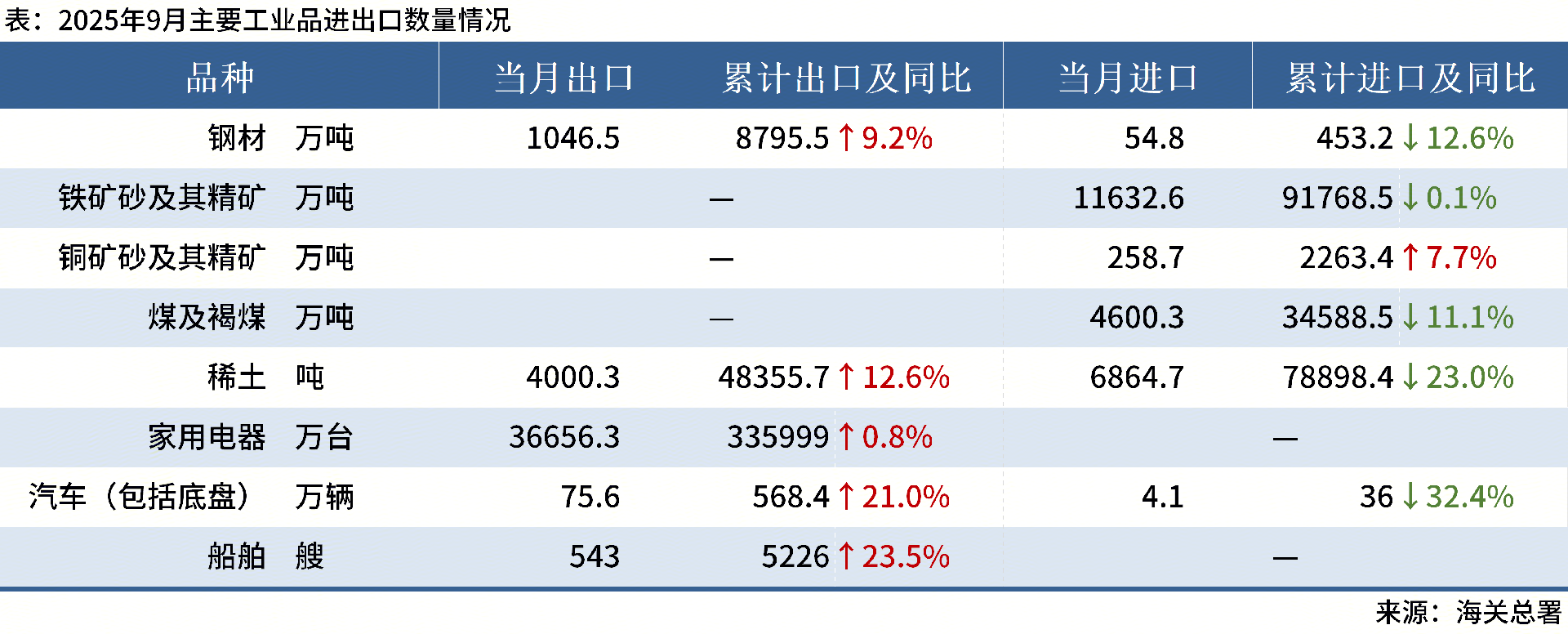 ◎ 海關(guān)總署:9月中國(guó)出口鋼材1046.5萬(wàn)噸;1-9月累計(jì)出口鋼材8795.5萬(wàn)噸,同比增長(zhǎng)9.2%。其他主要工業(yè)品進(jìn)出口情況如下: