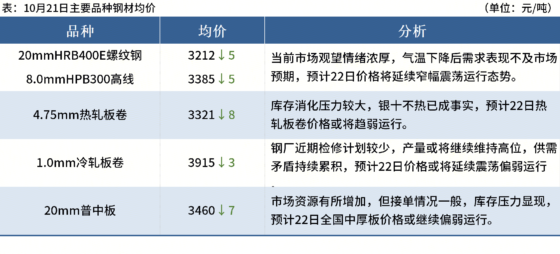 ◎10月21日,江蘇永鋼出臺(tái)10月下旬出廠價(jià),螺紋鋼下調(diào)50元/噸、線材盤螺下調(diào)50元/噸,現(xiàn)螺紋鋼3400元/噸,線材盤螺3600元/噸。